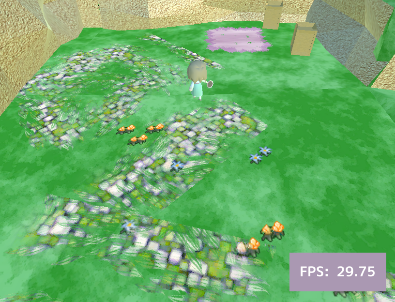 地面が草地ばかりで、味気ない印象だったので、草地が広い範囲を占めないように装飾を散りばめました。